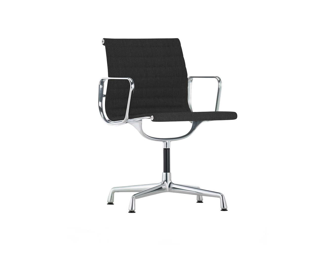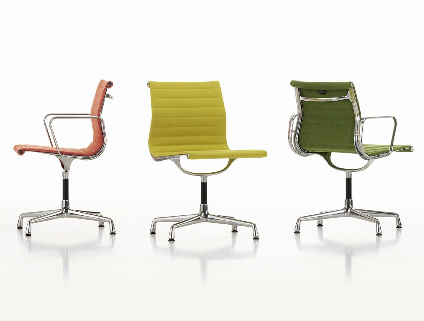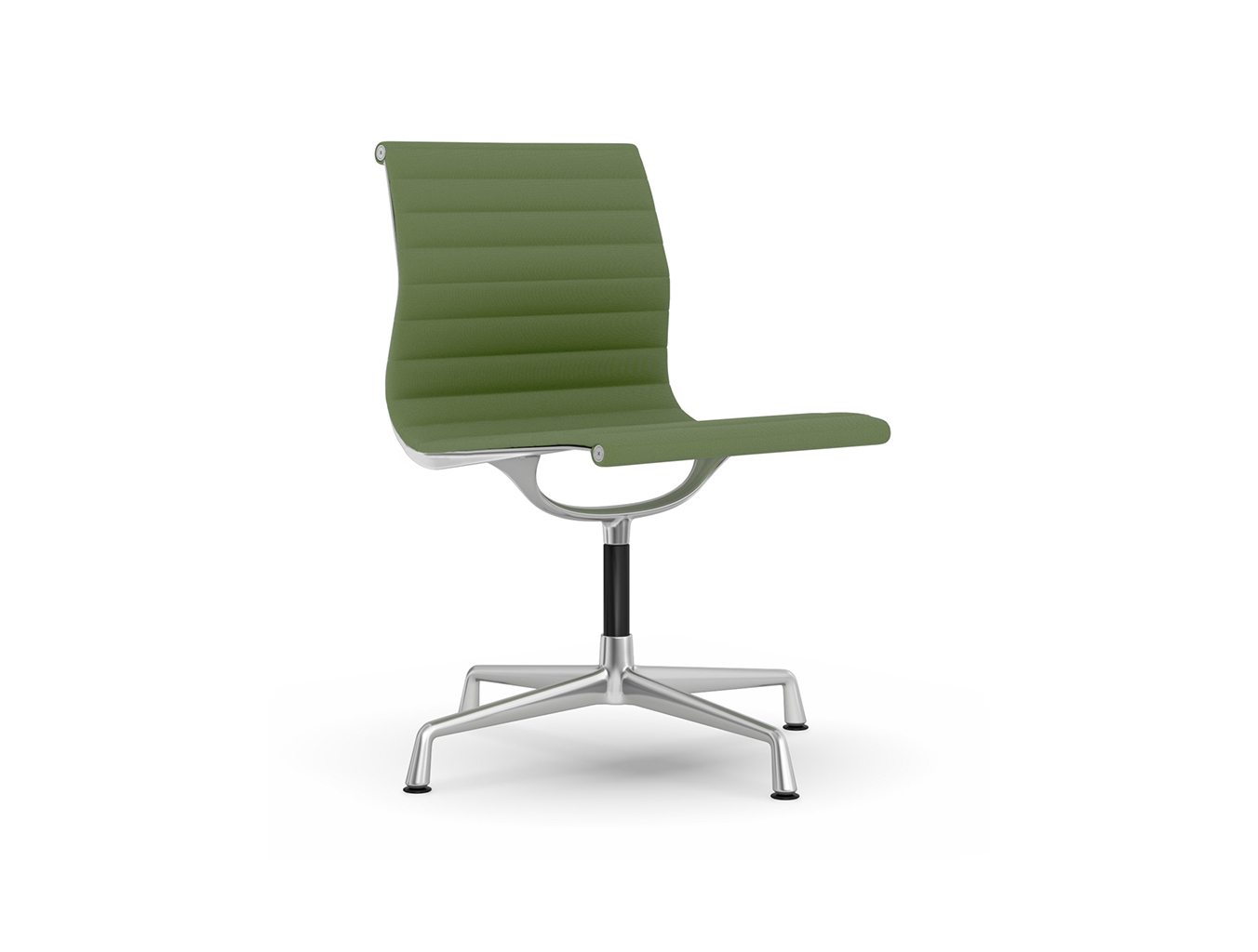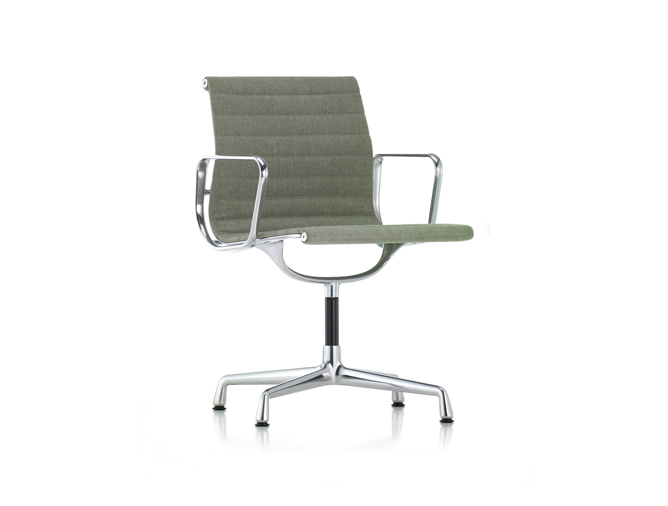 Aluminum Chairs EA 101, EA 103 and EA 104 by Charles and Ray Eames are ideal for use in combination with a table: compared to the other models of the Aluminum Group, they are somewhat lighter, taller and narrower. Thanks to the wide range of soft and vivid colors for the upholstery, it is easy to find the perfect chair for any dining room. The three models differ by the type of base - fixed or rotating - and by the presence or absence of arms.