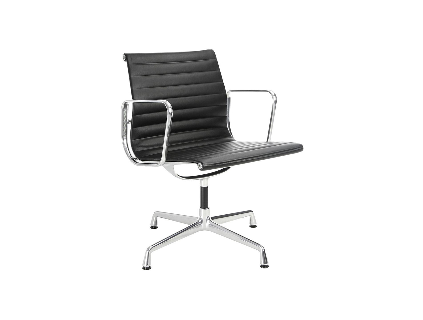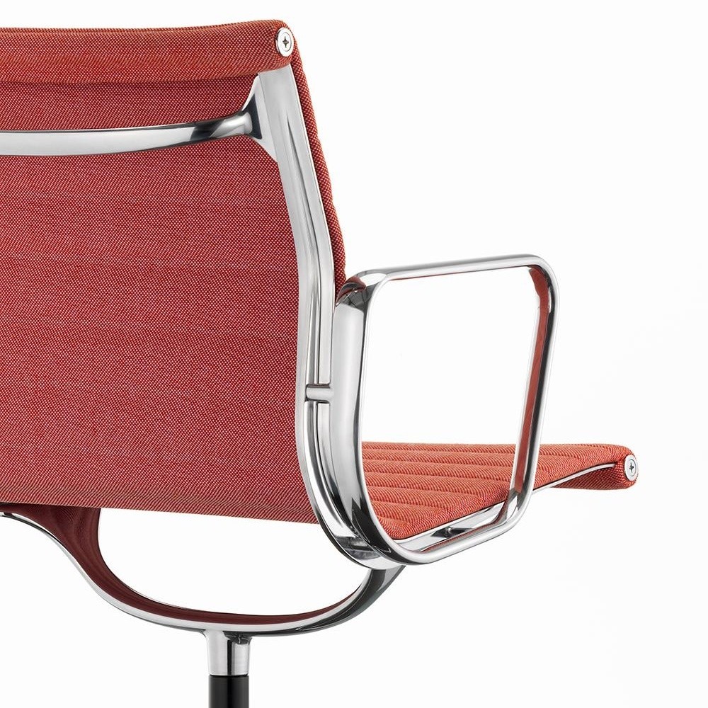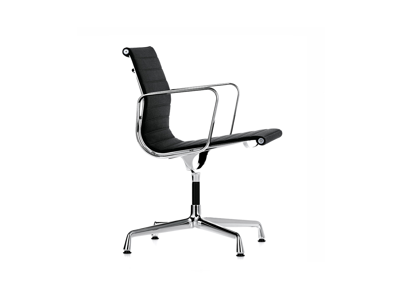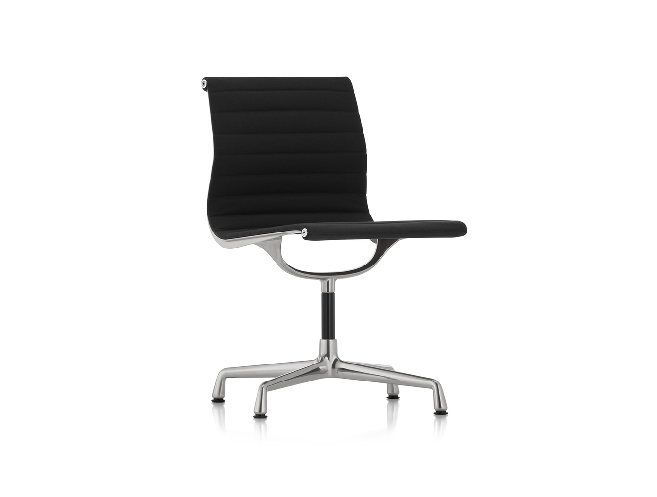 Aluminum Chairs EA 101, EA 103 and EA 104 by Charles and Ray Eames are ideal for use in combination with a table: compared to the other models of the Aluminum Group, they are somewhat lighter, taller and narrower. Thanks to the wide range of soft and vivid colors for the upholstery, it is easy to find the perfect chair for any dining room. The three models differ by the type of base - fixed or rotating - and by the presence or absence of arms.