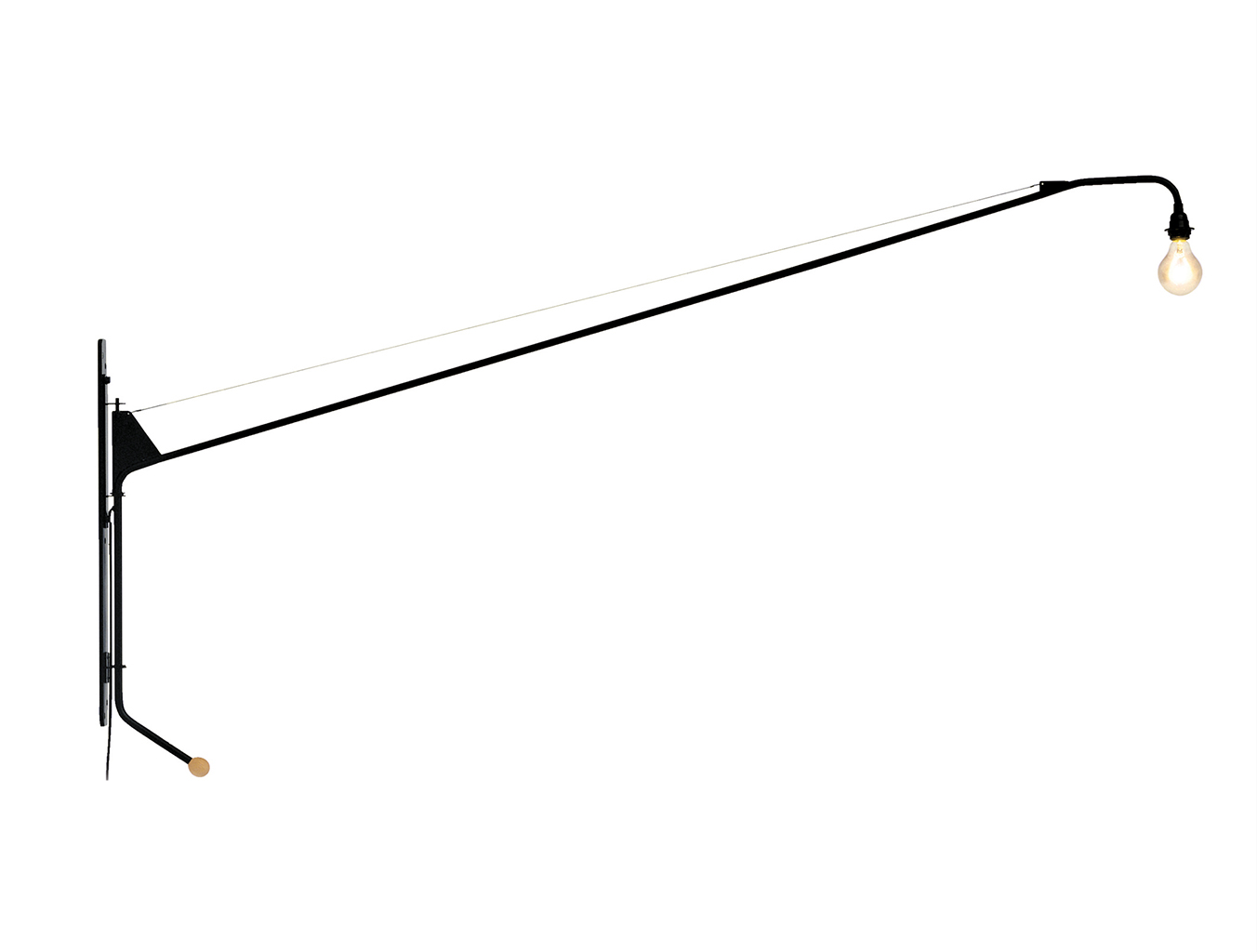 The Potence wall lamp is one of Jean Prouvé's puristic masterpieces. Reduced to the essentials – a light bulb and a pivoting wall mount – the long swing arm wall light is made of powder-coated tubular steel with a beechwood handle. The lamp is controlled by a cord dimmer and comes equipped with a light bulb.