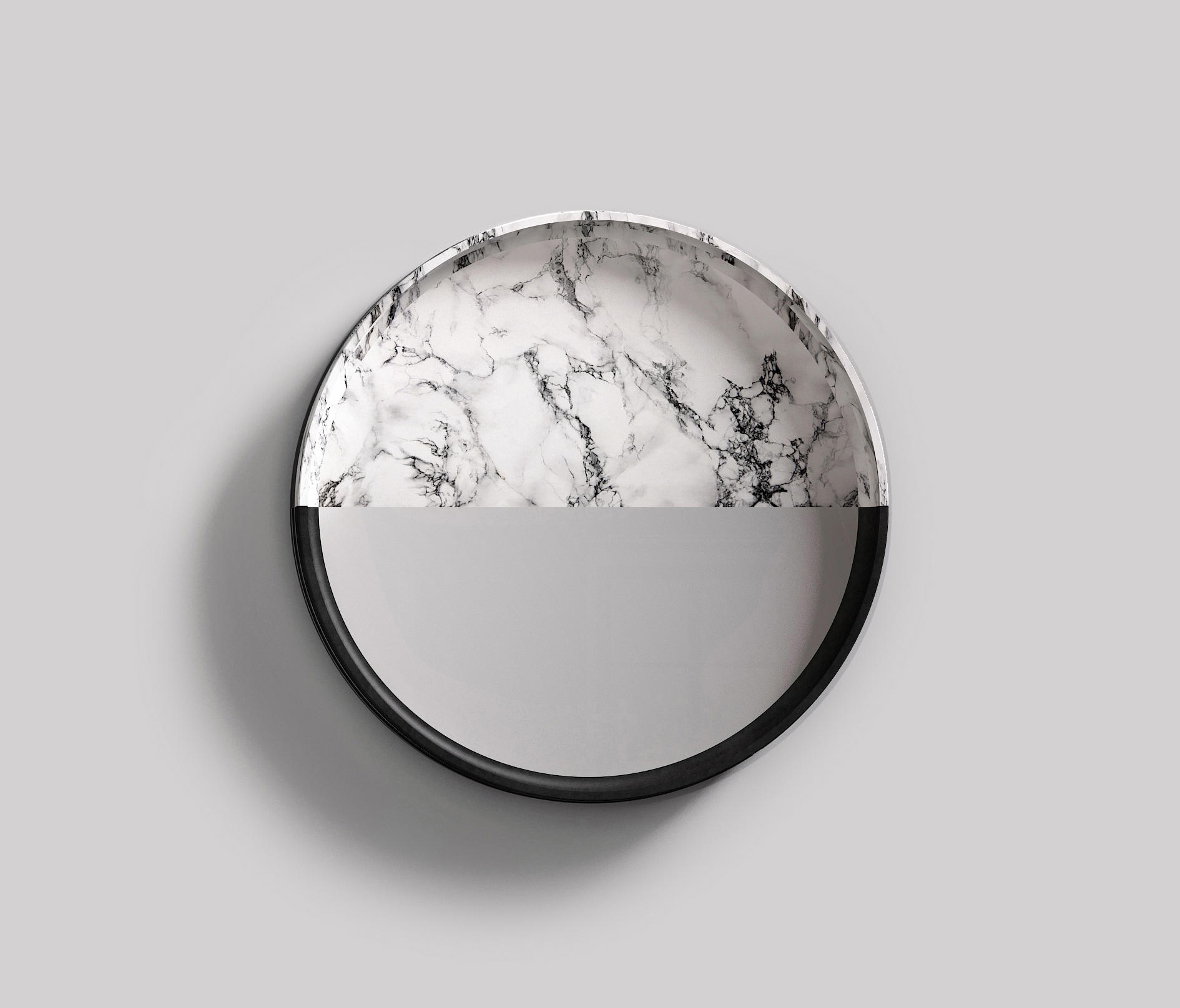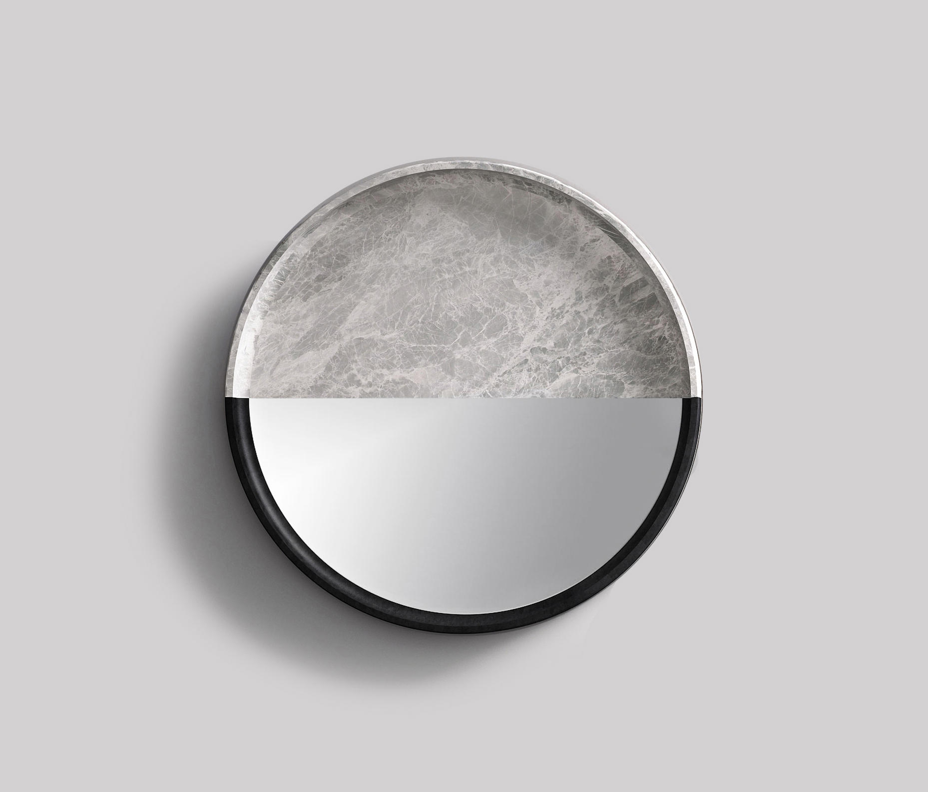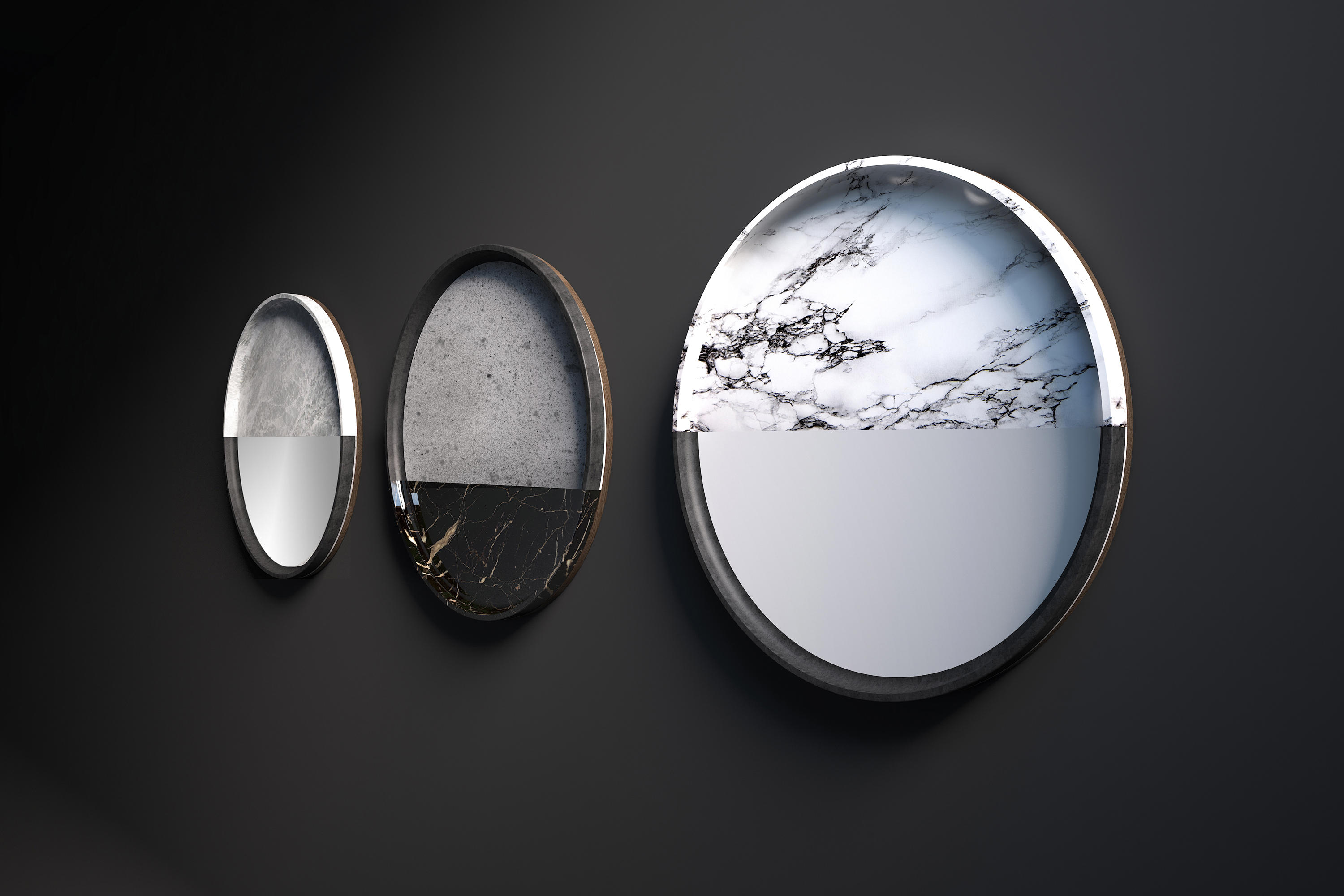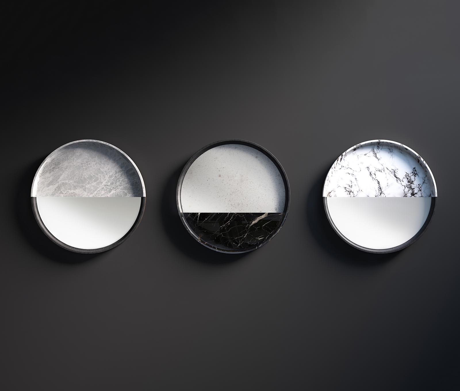A range of mirrors where glass enhances marble and stone textures. Lightness and solidity, elusiveness and presence, lights and shadows: opposite attract in essential and surprising forms. Hung over dark or light walls, one after the other, the three units decorate the room setting with a bright touch.