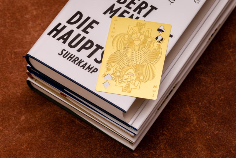 By turns grim or gleeful (perhaps it depends on the reading matter), the Joker slips between the pages to hold your place. This bookmark is fashioned from sheet brass and digitally etched with a playing-card pattern. The range also features a Quill, Hand Pointer, Postcard and Dandelion.